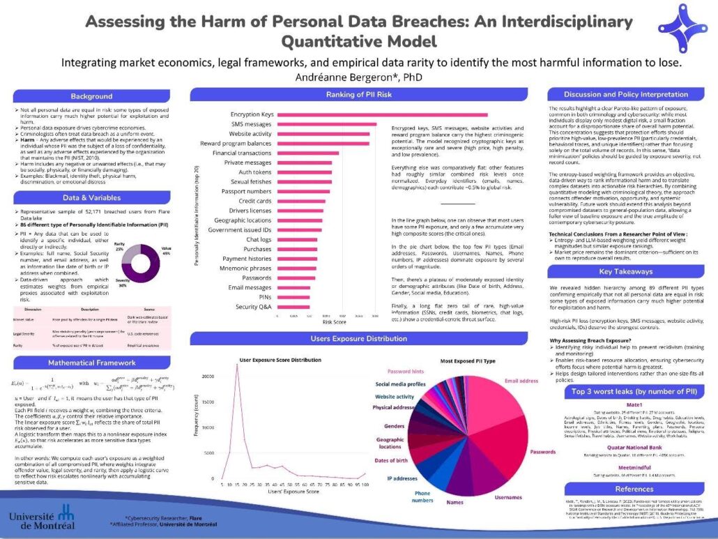 Our poster (appears below) presented our ongoing research on scoring users’ exposure levels, focusing on how different types of exposed information influence overall risk. We revealed a hidden hierarchy among 89 types of personally identifiable information (PII), empirically confirming that not all personal data carries equal risk.