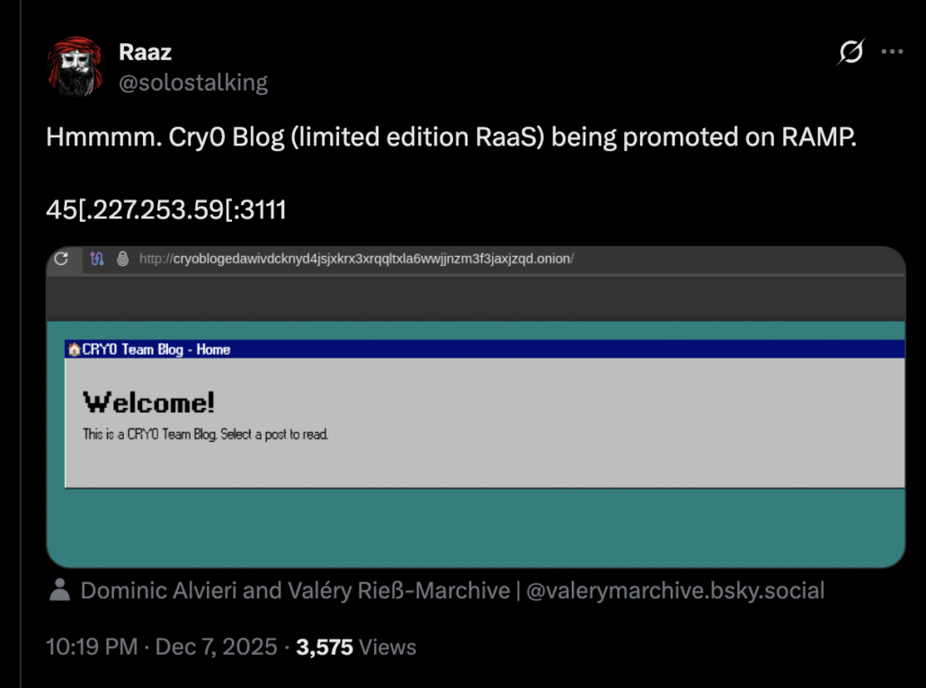 The group operates a data leak site (DLS) accessible via Tor at: cryoblogedawivdcknyd4jsjxkrx3xrqqltxla6wwjjnzm3f3jaxjzqd.onion