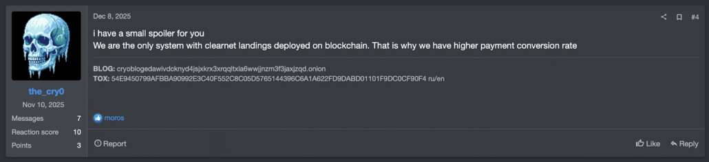 Cry0 operators advertise their blockchain-based payment infrastructure on cybercrime forums