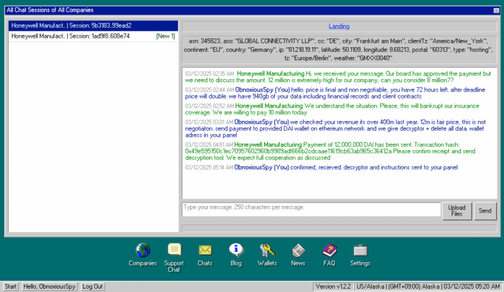 In their RaaS advertisement, the group displays what appears to be a ransom negotiation with Honeywell Manufacturing, allegedly resulting in a $12 million DAI payment.