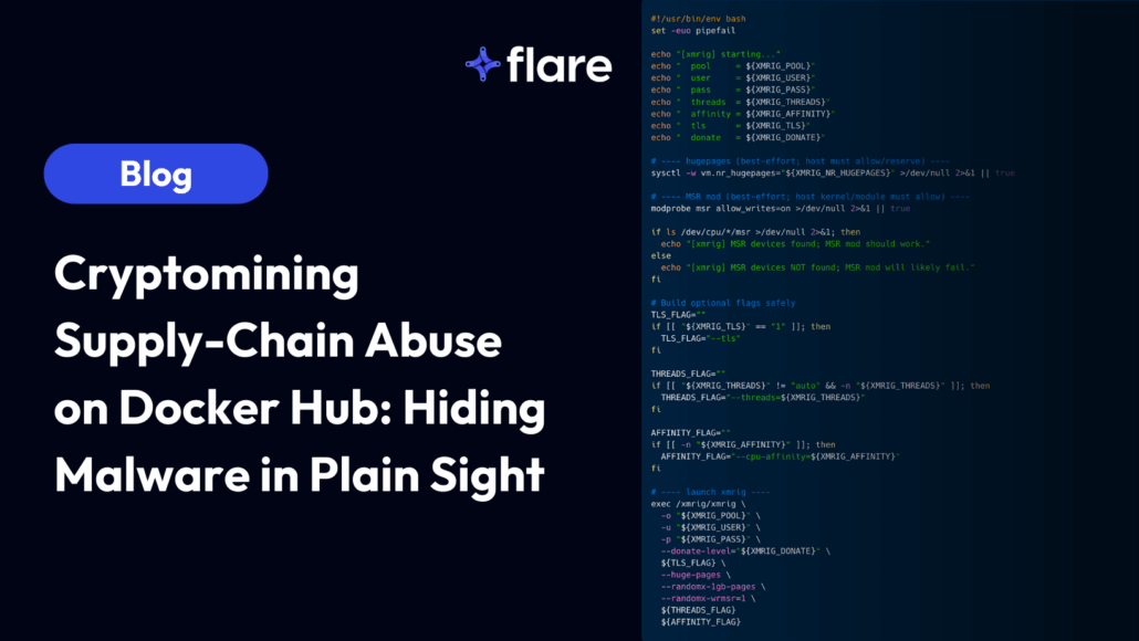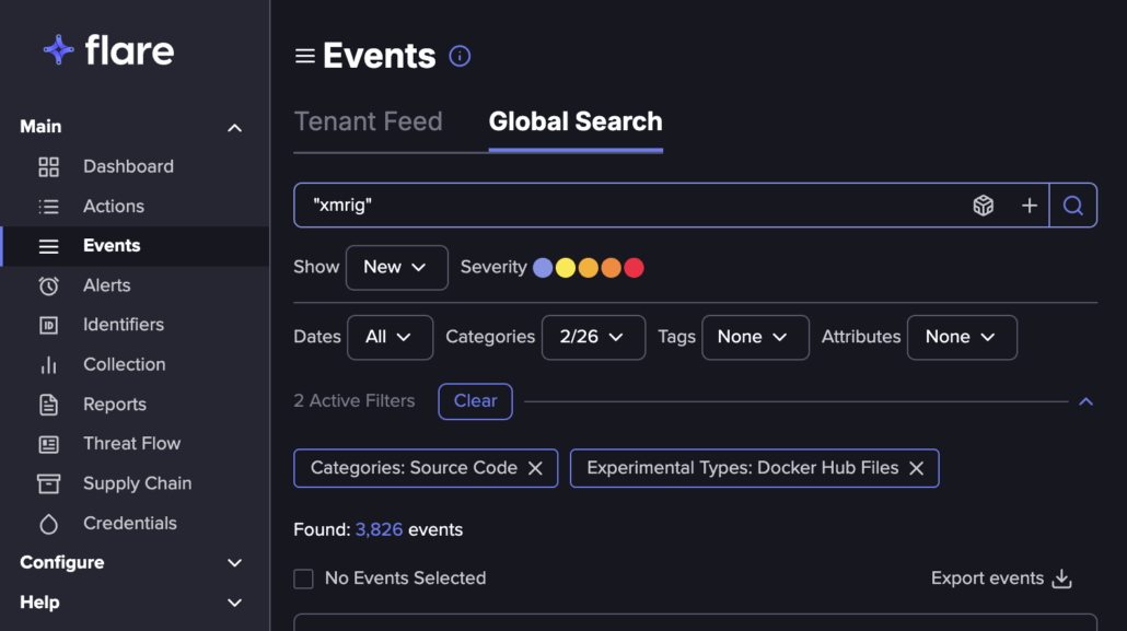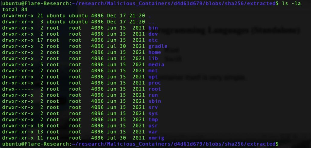 One of the results we found, and “xmrig” was hidden inside the container image (Flare link to post, sign up for the free trial to access if you aren’t already a customer)
