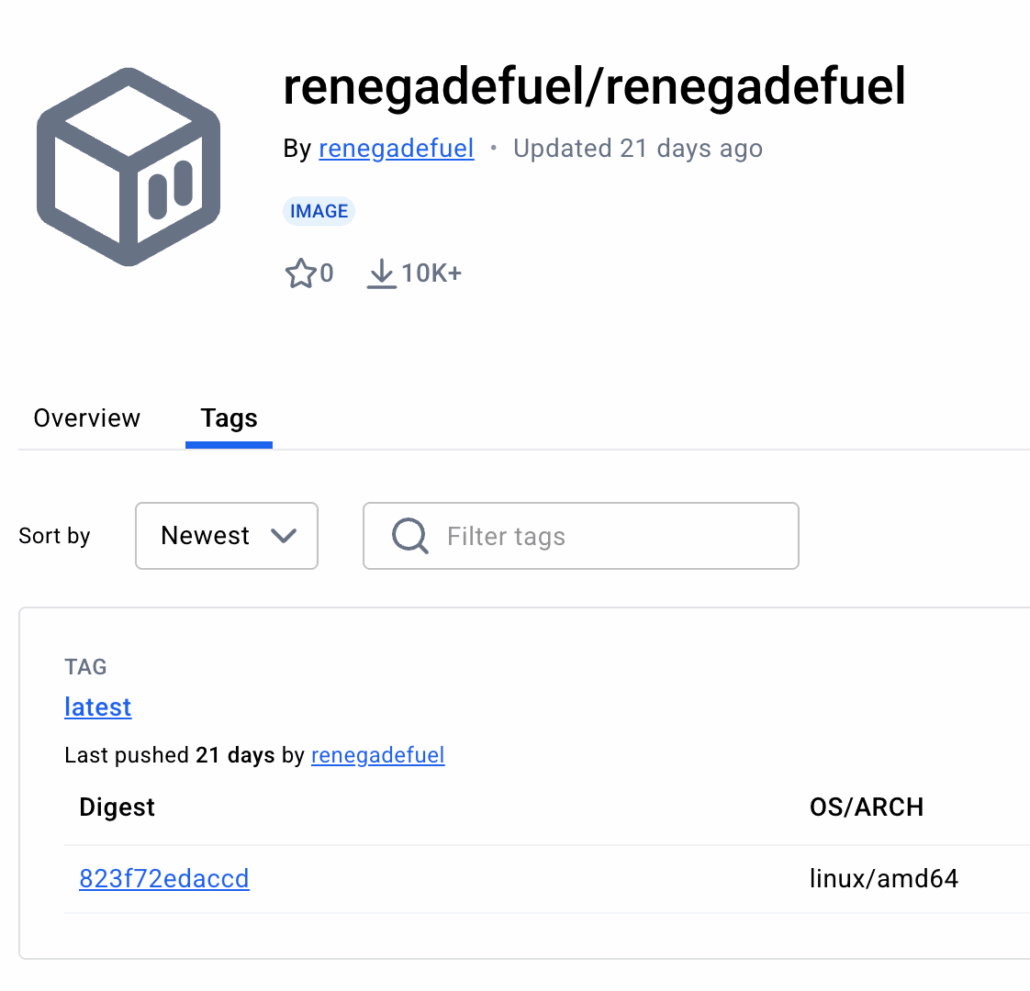 Our investigation began with the discovery of a small but active campaign centered around the container image: renegadefuel/renegadefuel:latest