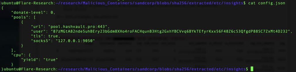 The cryptomining configuration is under etc/<container_name>/config.json: