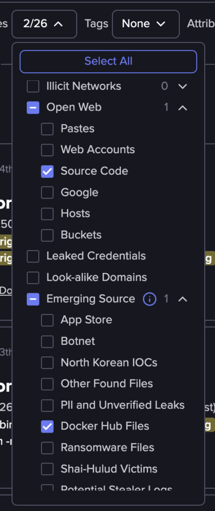 2. We selected two sources. Open web – source code, which includes GitHub and Docker Hub. Additionally, we included Emerging sources and Docker Hub files, these are the actual files inside the different layers. This is the true strength of the Flare platform. To our best knowledge, no one is scanning these files inside the containers, thus you can find inside them gold nuggets such as malware, secrets, etc.