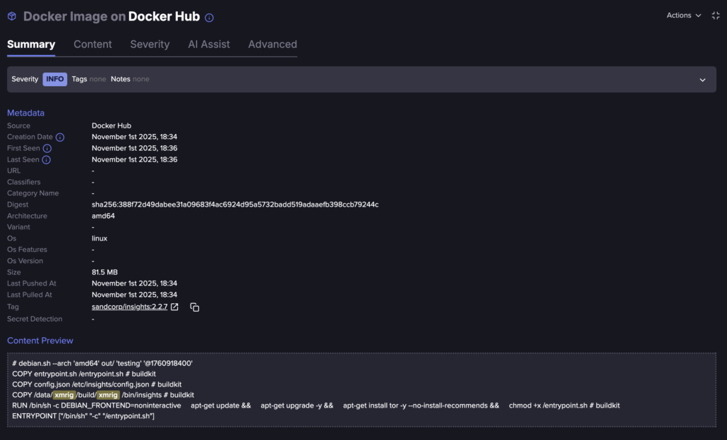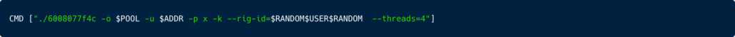 Crucially, the container’s CMD and entrypoint are explicitly configured to execute the cryptominer upon container startup. This means that any user running the image (intentionally or not) immediately executes mining malware. There is no additional loader, exploit, or user interaction required.