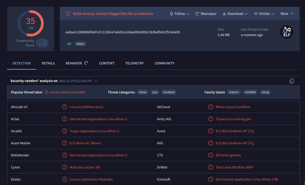 Inside this second technology-named directory, we found a single binary file. Based on VirusTotal analysis, this binary is a cryptominer.