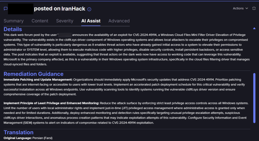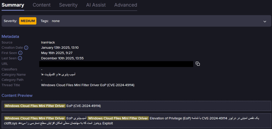 This is borne out by a forum posting we found in Flare from January 2025 on IranHack linking to an exploit for another EoP vulnerability in this component, CVE-2024-49114 that was patched in December 2024, had been sighted. Further investigation by Flare researchers shows that this posting points to a PacketStorm download link of the Google Project Zero exploit.