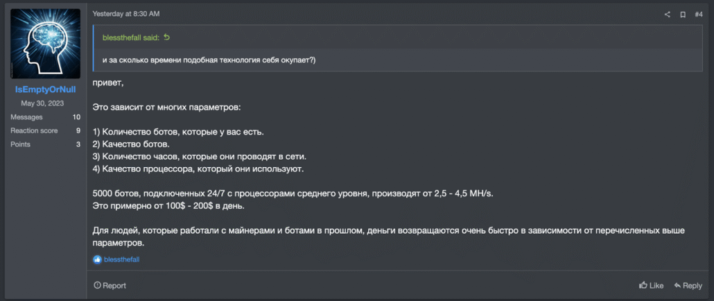 This illustrates why cryptojacking operations require massive scale. Each infected host yields only a few cents per day, making profitability entirely dependent on botnet size and consistent uptime. The developer’s pitch that “money returns quickly” only applies to operators who already control thousands of compromised machines.