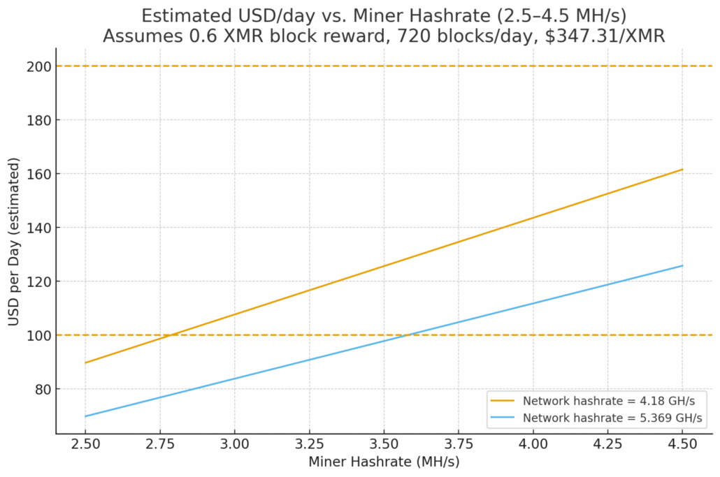 The calculated range of $70 to $162 per day broadly validates the developer’s claimed $100 to $200 range, though actual results will vary with XMR price volatility and network hashrate fluctuations.