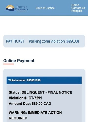 The fraudulent webpage shows a parking ticket