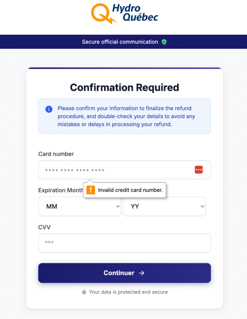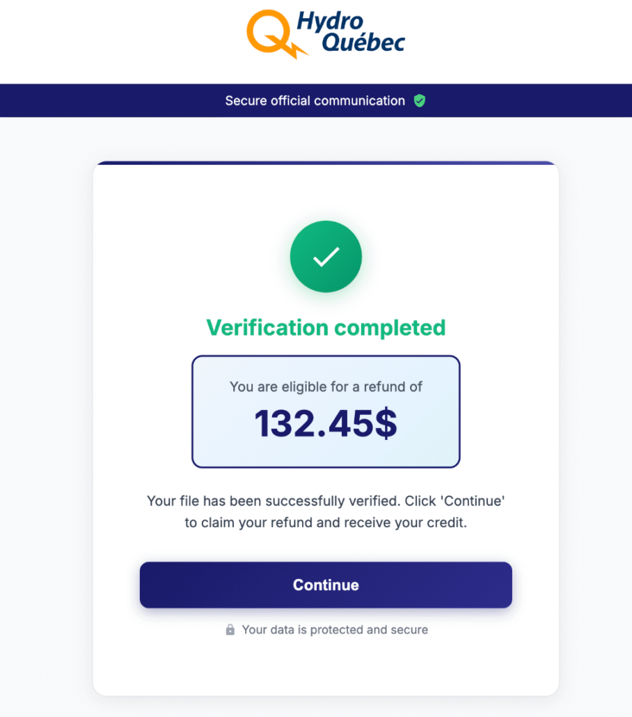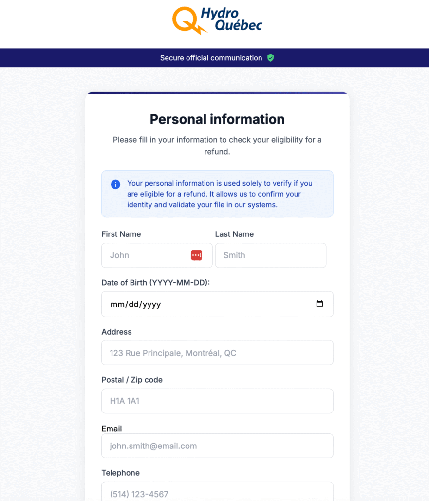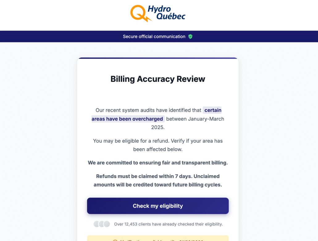 As we investigated the fake BC government domain we uncovered an additional domain, coveragesurcharge-reversal[.]ca, which was active at the time of writing and impersonated a billing accuracy notice purportedly from Hydro-Québec. The notice informed recipients that “recent system audits have identified that certain areas have been overcharged between January and March 2025” and advised that they “may be eligible for a refund,” prompting them to verify whether their area had been affected.