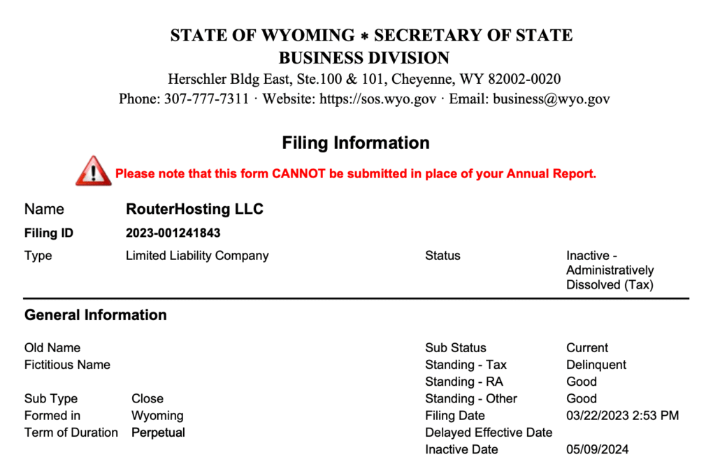 ARIN’s official records show that the record for RouterHosting LLC was last updated in May 2023 and it continues to have an ASN number assigned to it. Additionally, despite being dissolved, the ARIN records continue to show the Wyoming address.