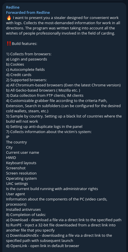 Malicious actors increasingly use the Telegram messaging app to purchase and deploy their RedLine stealer malware.