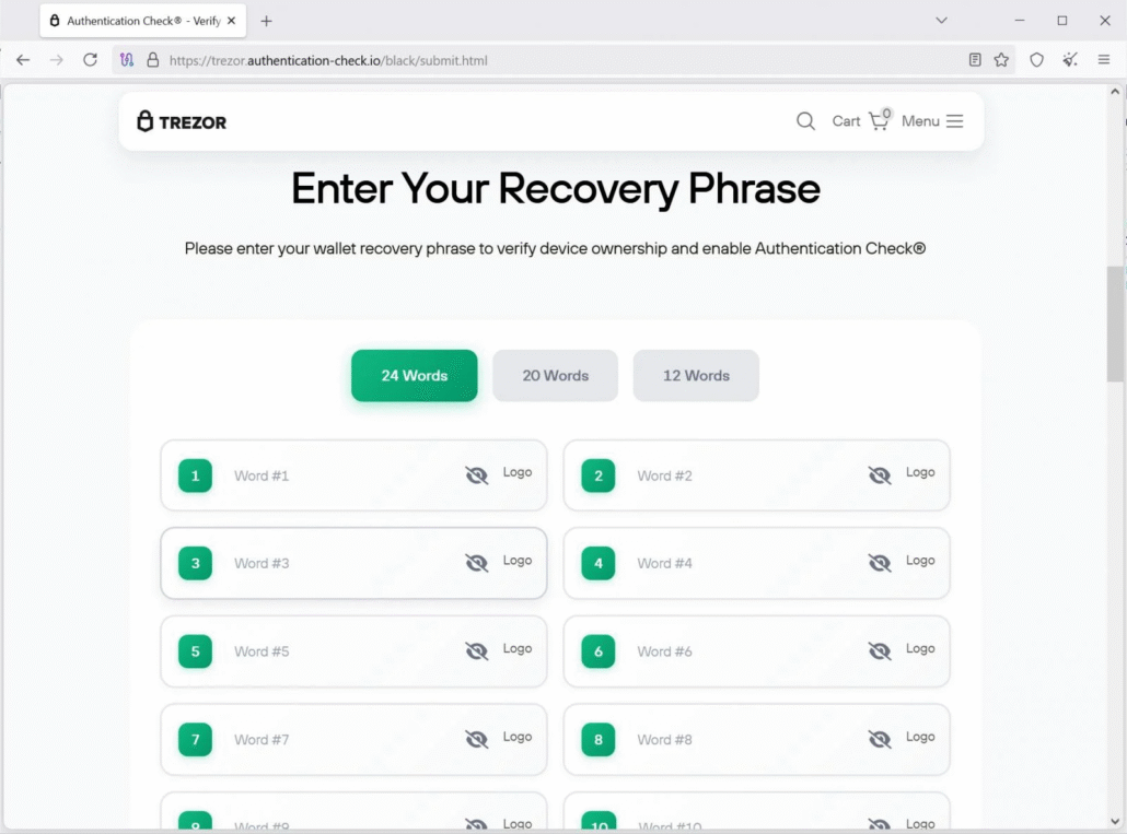 On February 12th, 2026, security researcher Dmitry Smilyanets posted to X that he had received a physical letter supposedly from Trezor, the crypto hardware wallet company, regarding a “Mandatory Authentication Check.” He quickly identified it as a scam designed to trick Trezor customers into uploading their private keys to a phishing website.