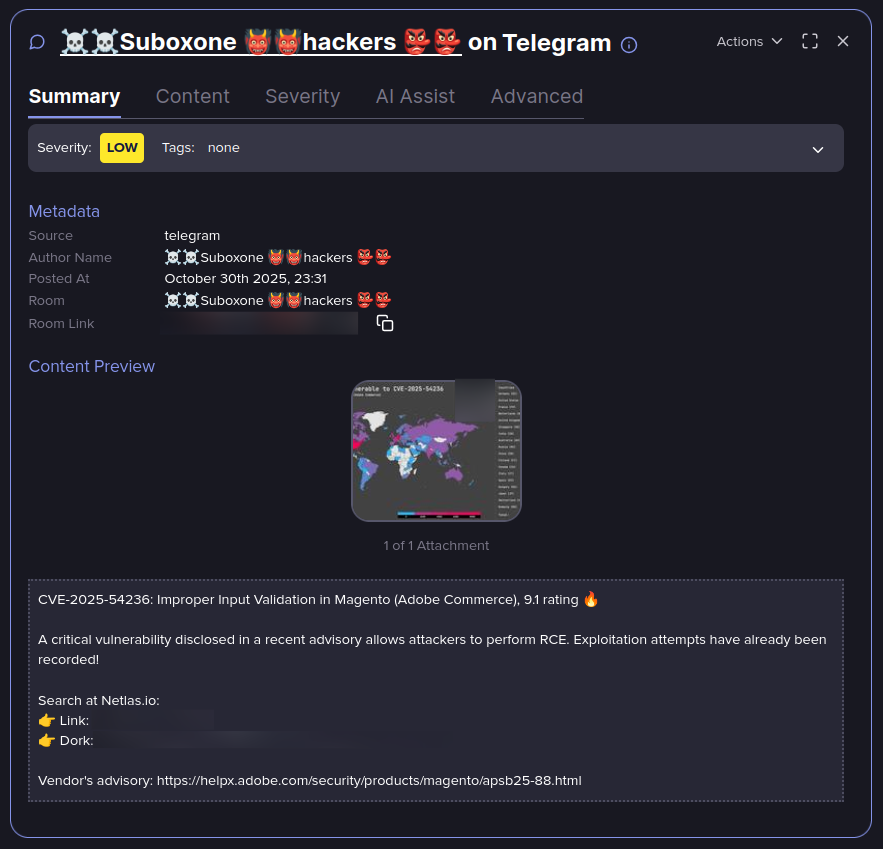 Since Adobe published its advisory for CVE-2025-54236 on September 9th, 2025, we immediately began tracking references in Flare, where daily mentions steadily accumulated. Initially, these were mentions of legitimate security research and media coverage, but also with a parallel current of increasingly darker and more operational discussions.