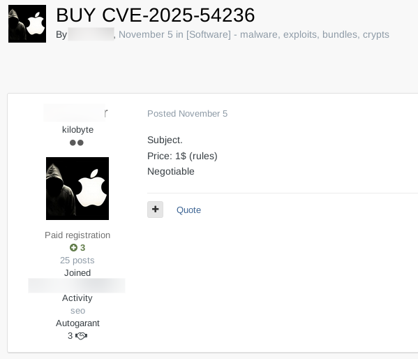 Threat actor sells a working exploit for CVE-2025-54236 for “$1 negotiable” (Source: Flare)