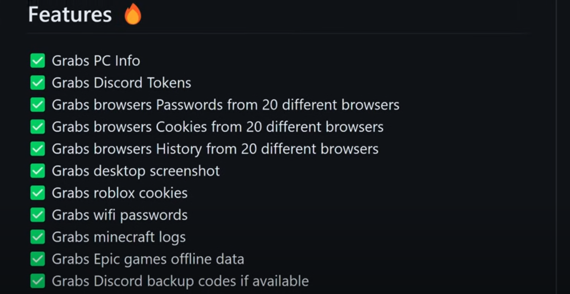 This is part of an advertisement for infostealer malware on Telegram, and explains what information it can steal from a computer browser
