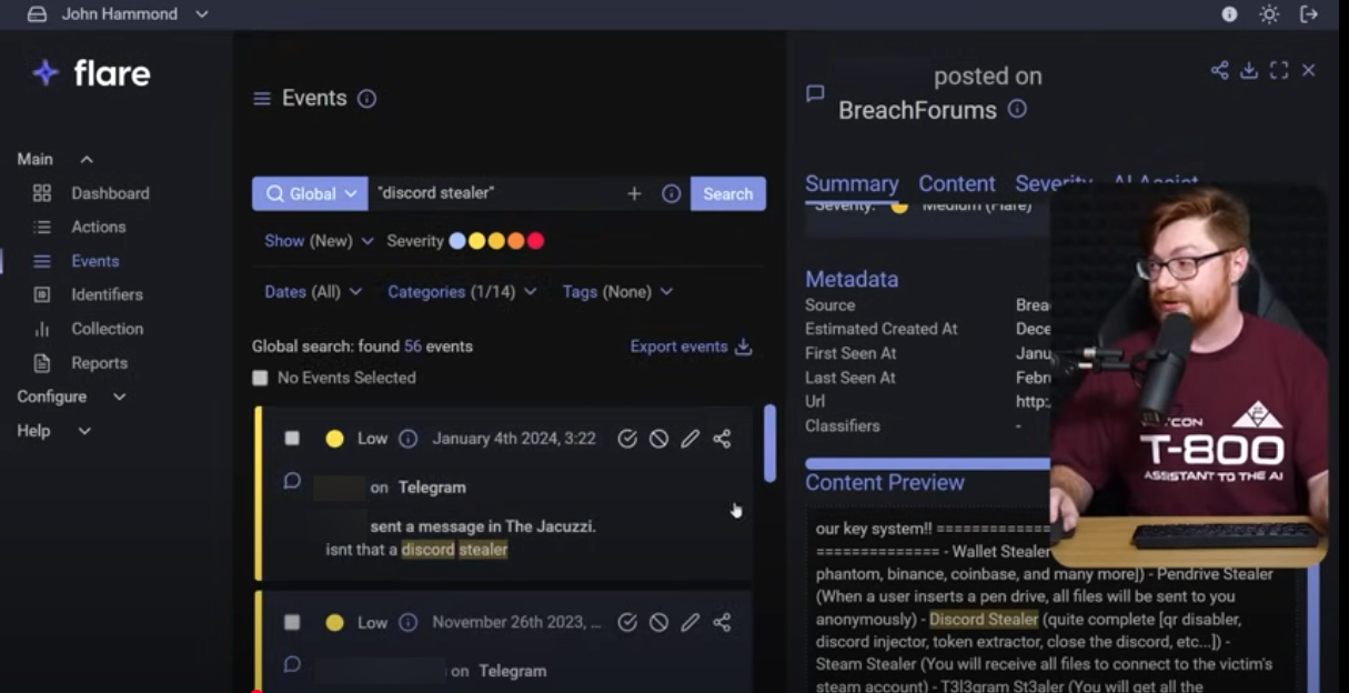 John pokes around Telegram with Flare and searches terms like “discord stealer” to see threat actor chatter about infostealer malware that targets Discord accounts.