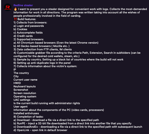 - Actors can employ a direct to consumer model of crime – Threat actors can easily distribute their own stealer logs, malware and other threats without the need to pay escrows on traditional dark web marketplaces.
