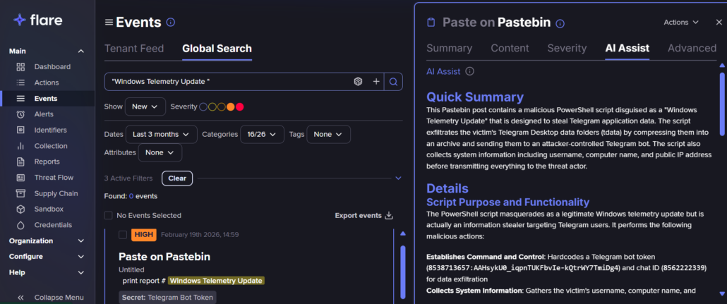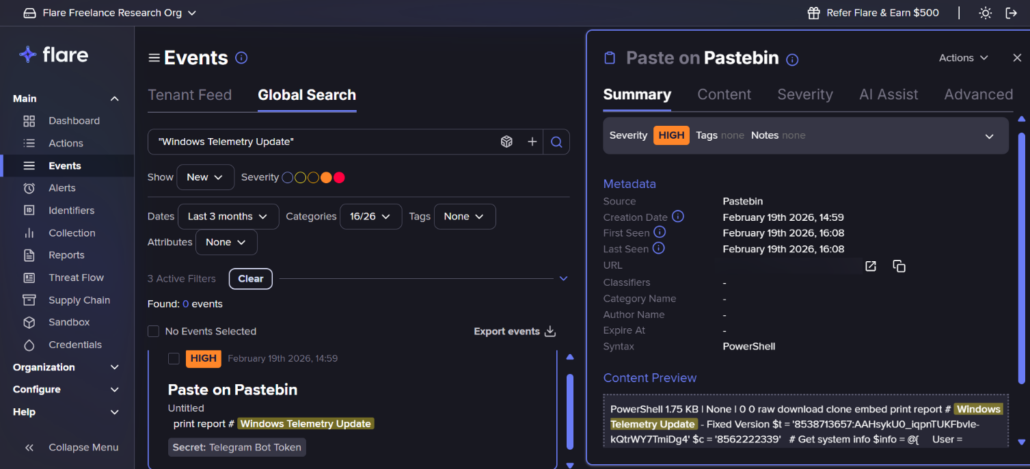 A PowerShell script titled “Windows Telemetry Update” sounds like the kind of routine system process most users would never question. This is exactly what the threat actor author was counting on. Flare flagged this Pastebin-hosted script as a high-severity threat, and our analysis revealed a purpose-built Telegram session stealer that targets desktop session data, exfiltrates it through the Telegram Bot API, and shares infrastructure with a separate web-based session capture tool.