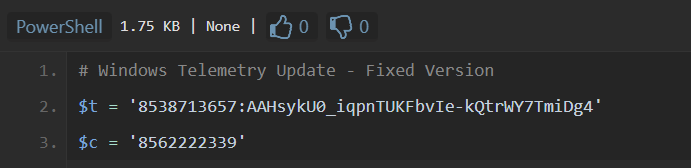 | Execution | T1204.002 | User Execution: Malicious File | Scripts titled “Windows Telemetry Update” designed for manual victim execution via social engineering; delivery vector not observed (technique inferred from script design and naming). |