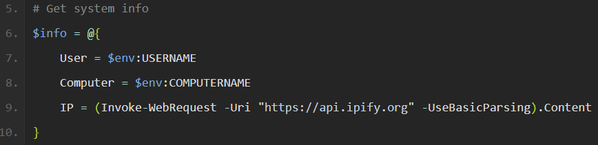| Discovery | T1082 | System Information Discovery | $env:USERNAME, $env:COMPUTERNAME, and public IP via api.ipify[.]org collected in both scripts prior to any exfiltration step. |