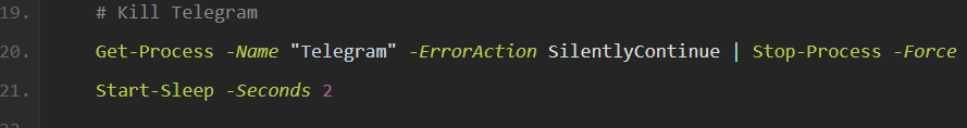The script forcibly terminates Telegram.exe to reduce file-lock conflicts on the directory prior to archival. The two second delay allows process termination and handle release to complete before compression begins. This behavior is consistent with awareness of Telegram Desktop’s file locking behavior and improves exfiltration reliability.