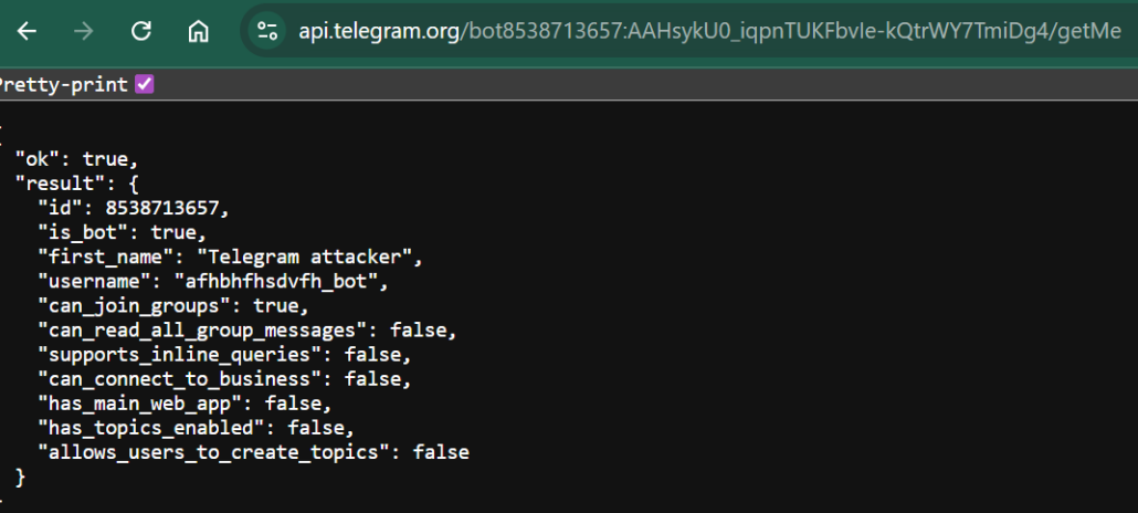 - Bot identity: afhbhfsdvfh_bot, display name “Telegram attacker,” resolved via /getMe against the hardcoded token.
