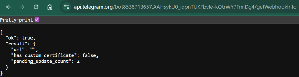 - Telegram Bot API: /getWebhookInfo response (infrastructure state)