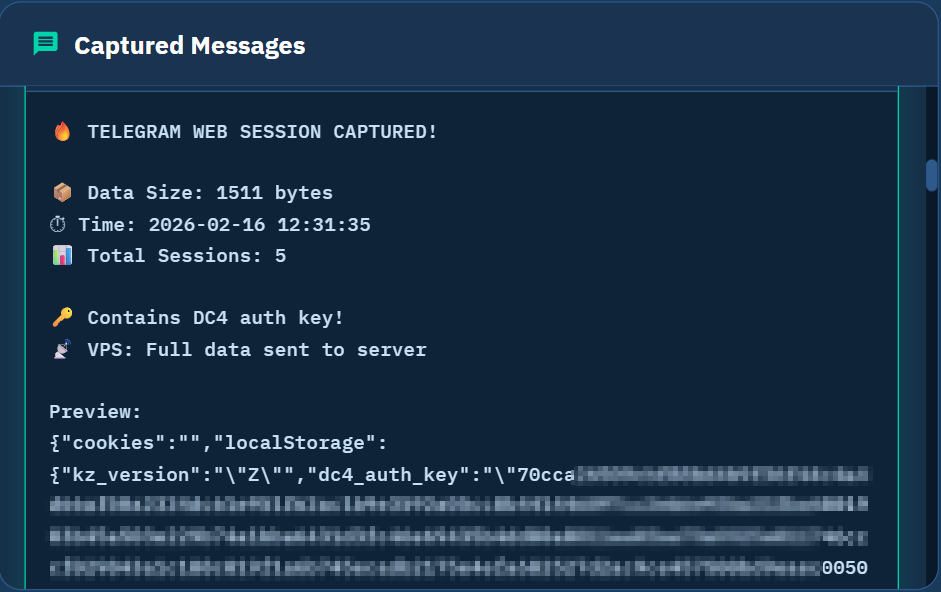 Both components demonstrate functional capability. The desktop module targets Telegram Desktop “tdata” session material, while the web component captures MTProto dcX_auth_key values from Telegram Web “localStorage.” Either artifact enables Telegram session replay without requiring account credentials. No victim activity was observed within the available telemetry window.