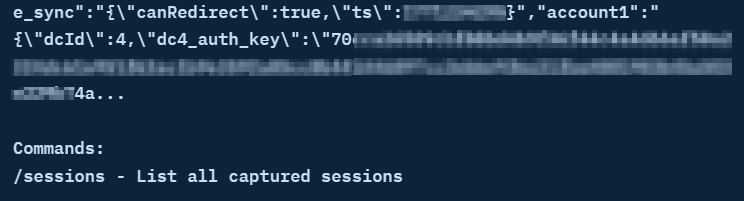 Captured message containing “dcId” and a per-account “dc4_auth_key”