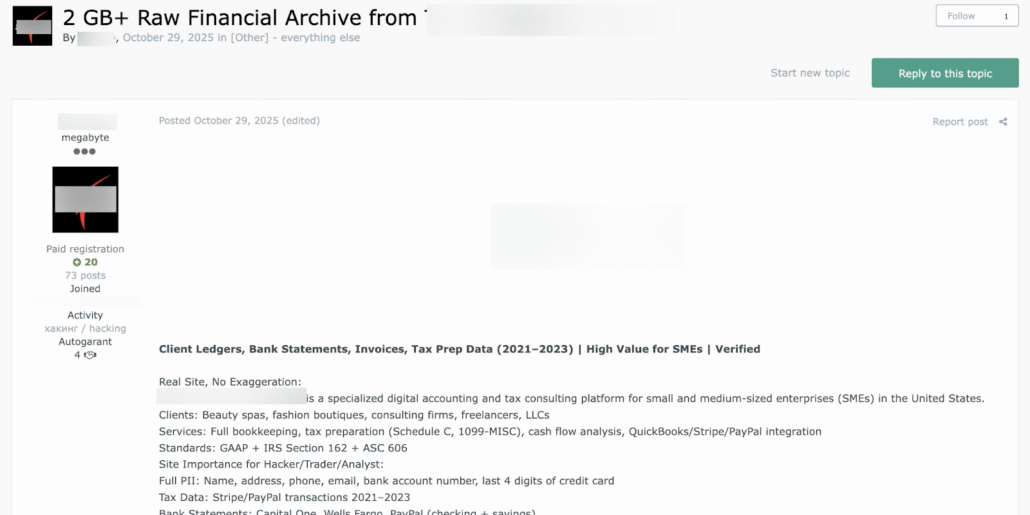 In October 2025, a threat actor posted a 2GB archive from an accounting firm to a cybercrime forum. The contents were client ledgers, bank statements, and financial records. For tax fraud operators, this was gold. Bank statements reveal prior-year income. Client ledgers show employer names and EINs. Combined with SSN and address data from other breaches, these records become complete “fullz” packages ready for filing.