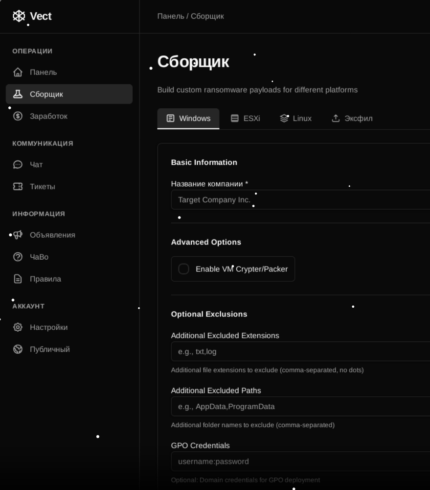 GPO Credential Integration: A “GPO Credentials” field allows affiliates to input Domain Admin credentials directly into the payload builder, enabling automatic distribution via Group Policy Objects without external scripts. This significantly streamlines mass deployment across Windows domains.