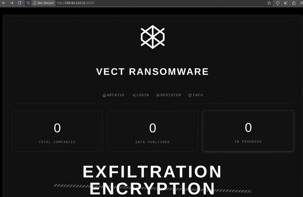 Security researcher RaaZ identified a Vect data leak site (DLS) hosted at 158.94.210[.]11:8000. At the time of this analysis, the site is no longer accessible, suggesting the group may be transitioning infrastructure or operating in stealth mode before launching attacks.
