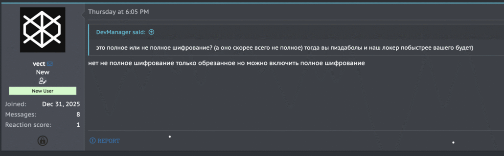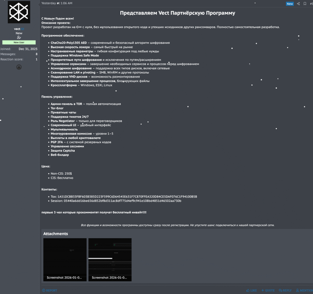 A sophisticated new ransomware-as-a-service (RaaS) operation named Vect has emerged on the Russian-speaking cybercrime forum Rehub. The developers claim a codebase written entirely from scratch in C++, with dedicated support for Windows, VMware ESXi, and Linux environments. With an aggressive affiliate program offering up to 88% commission and free access for CIS-based operators, Vect represents a significant new entrant in the enterprise ransomware ecosystem.