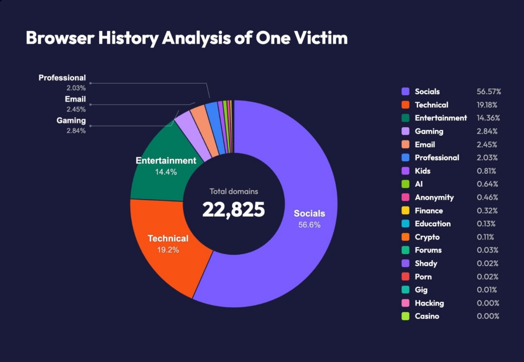 As shown in the graph below, stealer logs contain valuable information about a victim’s behavioral profile. Based on one victim browser history, they provide insight into the digital environments visited prior to compromise. To analyze these patterns, we classified the visited websites into behavioral categories to capture victims’ overall browsing behavior.