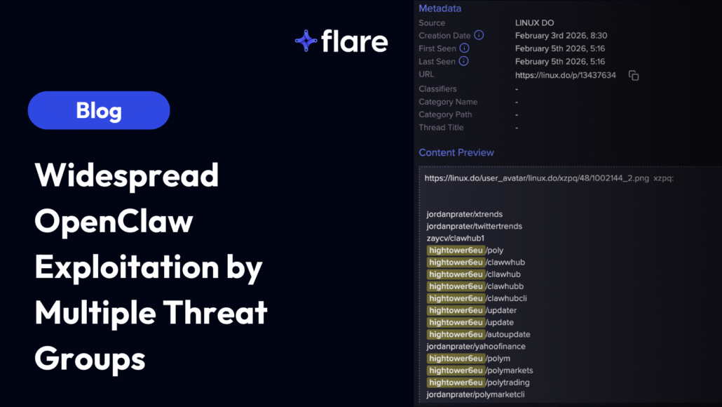 We have identified widespread exploitation of OpenClaw (formerly MoltBot and ClawdBot) AI agents by multiple threat groups in Flare. OpenClaw, an open-source autonomous AI assistant framework created by Peter Steinberger (now of OpenAI) achieved viral adoption in late January 2026, presents a high-severity risk profile due to its design architecture that grants extensive system privileges, persistent memory capabilities, and integration with sensitive messaging platforms and credentials.
