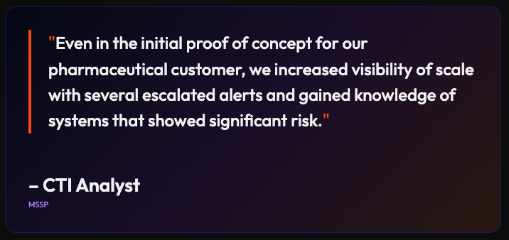 To help manage their goal and better understand the unique needs of the organization, the MSSP’s team utilized Flare to conduct an exposure monitoring proof of value. This proof of value included a feature demonstration and a high level assessment of the organization’s external exposure. When the customer uncovered results indicative of risk using the Flare platform, they used that data to improve monitoring for similar types of risk on a continuous basis.