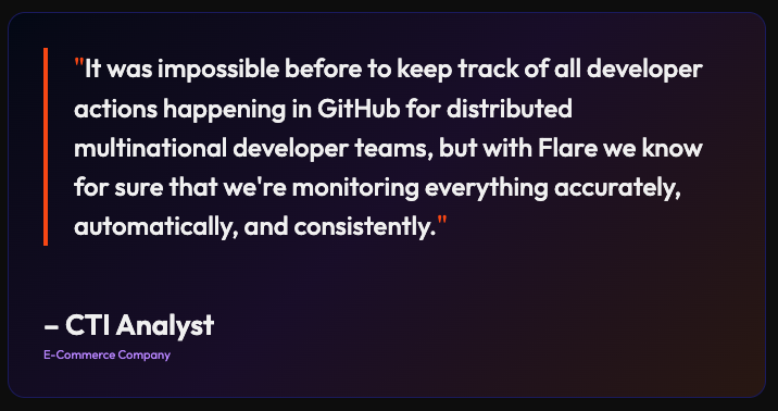 Since starting Flare, the security team has caught numerous API key and code leaks. With the comprehensiveness of Flare’s GitHub monitoring, this security team is confident in securing these clear web leaks.