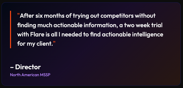 A senior pen tester with the MSSP had been trying out competing products for six months without finding much actionable information. However, it only took a few days of monitoring with Flare for he needed to realize the value Flare could bring to his company. Within a two week free trial with Flare, the pen tester uncovered high fidelity and actionable findings on behalf of his client.
