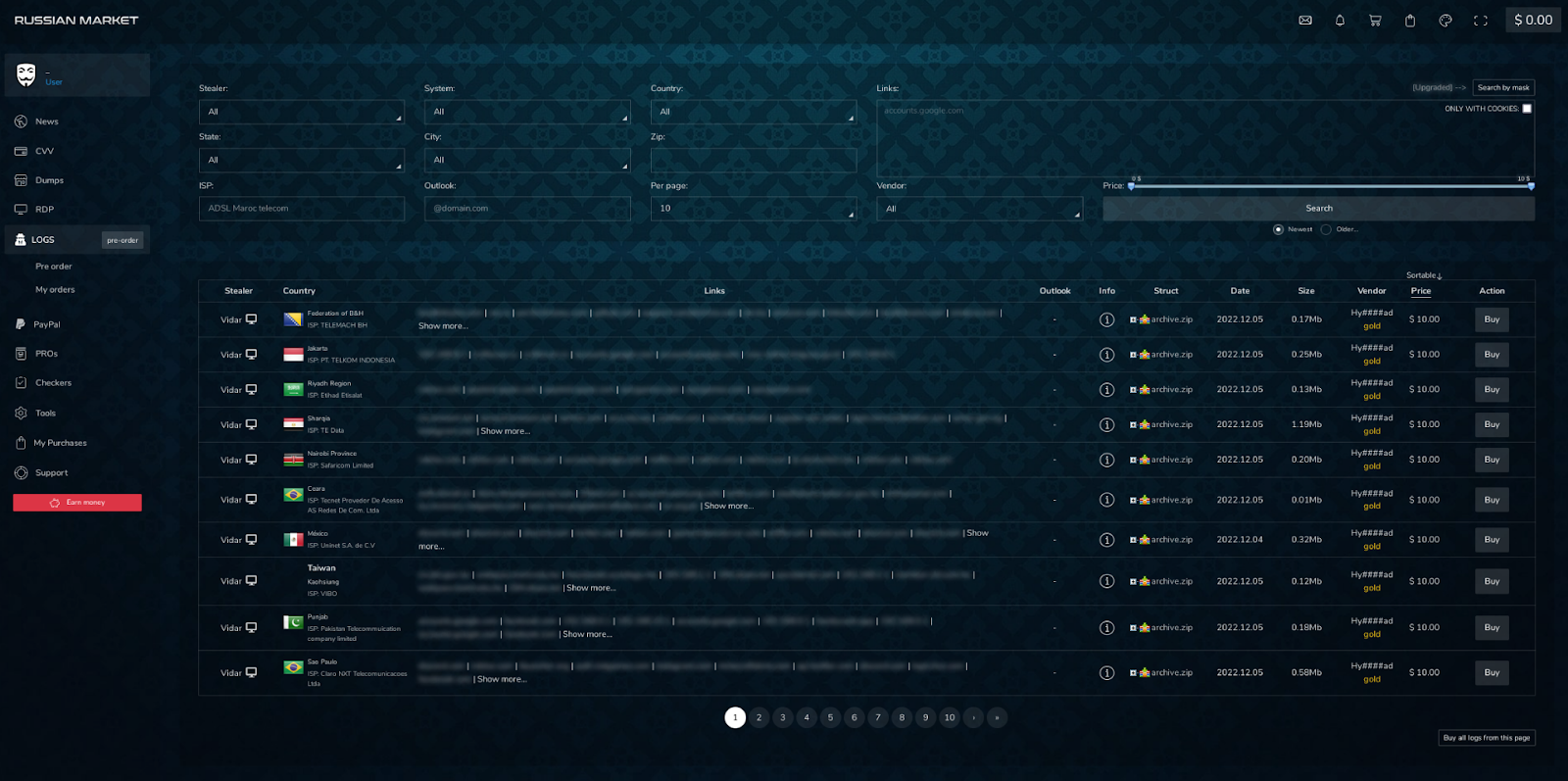 Russian Market is a dark web marketplace specializing in the sale of access to devices and information. Russian Market prices all logs equally at $10 per log and operates on the dark web.