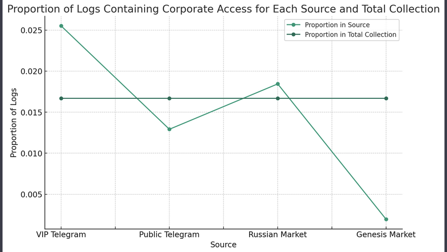Graph shows proportion of stealer logs containing corporate access for each source and total collection