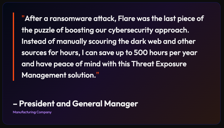 The manufacturing company’s President-General Manager ended up finding Flare, Threat Exposure Management (TEM) solution, through an educational video on dark web monitoring, and immediately signed up to access the free trial. He described the transition to using Flare and including it to the rest of their cybersecurity program as “very easy.” In addition, the user interface is straightforward to navigate.