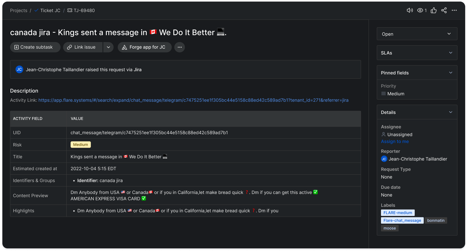 Here is what the resulting Jira Ticket can look like for a result found on Telegram channel ”🇨🇦 We Do It Better 💻”